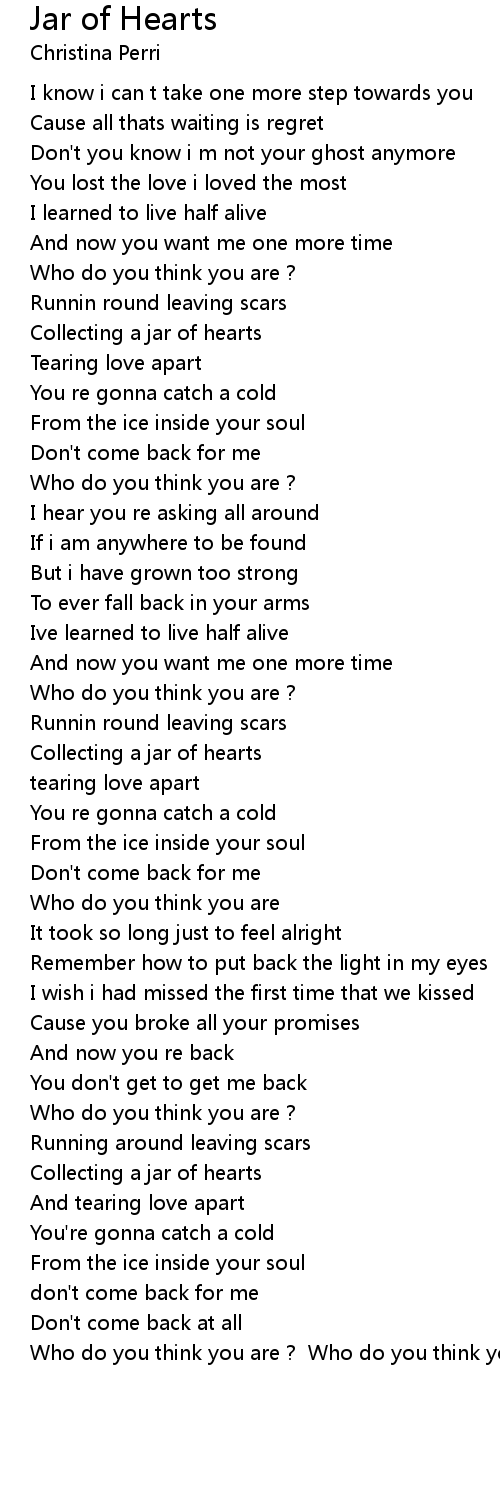 jar of hearts - christina perri (lyrics) -- download the "jar of hearts" music video on itunes! - Follow Christina Perri: - - - - - album lovestrong. is available now! - Follow Christina Perri on Spotify: - "jar of hearts" lyrics I know I can't take one more step towards you 'Cause all that's waiting is regret Don't you know I'm not your ghost anymore You lost the love I loved the most I learned to live, half alive And now you want me one more time Who do you think you are? Runnin' 'round leaving scars Collecting your jar of hearts And tearing love apart You're gonna catch a cold From the ice inside your soul So don't come back for me Who do you think you are? I hear you're asking all around If I am anywhere to be found But I have grown too strong To ever fall back in your arms I've learned to live, half alive And now you want me one more time Who do you think you are? Runnin' 'round leaving scars Collecting your jar of hearts And tearing love apart You're gonna catch a cold From the ice inside your soul So don't come back for me Who do you think you are? It took so long just to feel alright Remember how to put back the light in my eyes I wish I had missed the first time that we kissed 'Cause you broke all your promises And now you're back You don't get to get me back Who do you think you are? Runnin' 'round leaving scars Collecting your jar of hearts And tearing love apart You're gonna catch a cold From the ice inside your soul Don't come back for me Don't come back at all Who do you think you are? Runnin' 'round leaving scars Collecting your jar of hearts Tearing love apart You're gonna catch a cold From the ice inside your soul Don't come back for me Don't come back at all Who do you think you are? Who do you think you are? Who do you think you are? Connect with us : Facebook: - Spotify: - Twitter: - Instagram: - Let's Be Friends on Facebook // - "If you'd like to submit a video to the channel, please visit: - Or contact - Lyrics video for "jar of hearts" by christina perri #JarOfHearts #christinaperri #10thanniversary